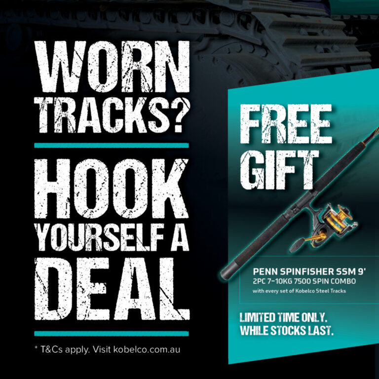 For a limited time, when you grab a set of genuine Kobelco rubber or steel tracks through Melbourne Tractors, we’ll chuck in a free fishing rod and reel combo. It’s our way of saying thanks — and giving you something to look forward to after a big week moving dirt.